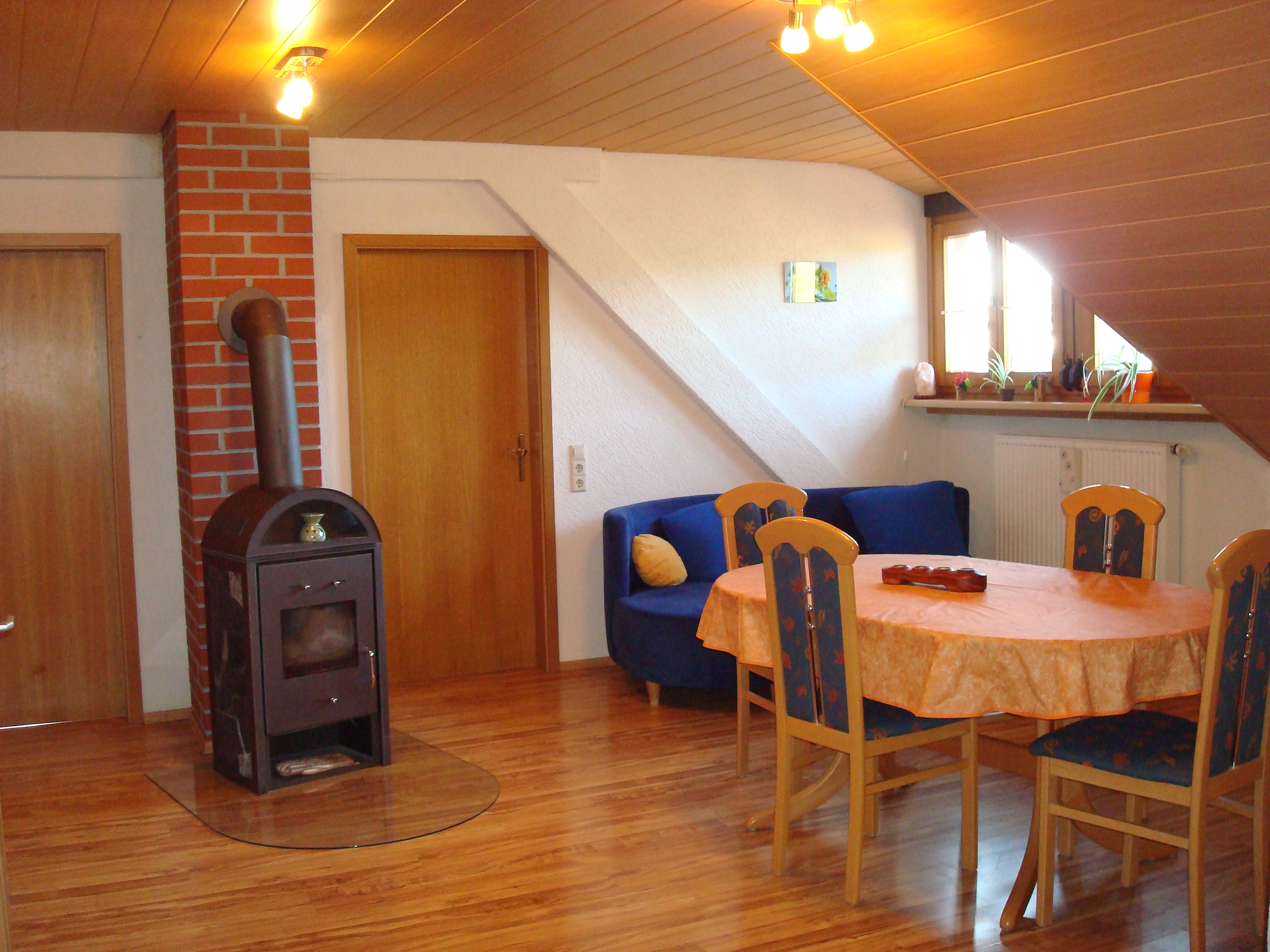 - Wohnzimmer mit Couch, Tisch mit Stühlen, Schwedenofen und Fernseher