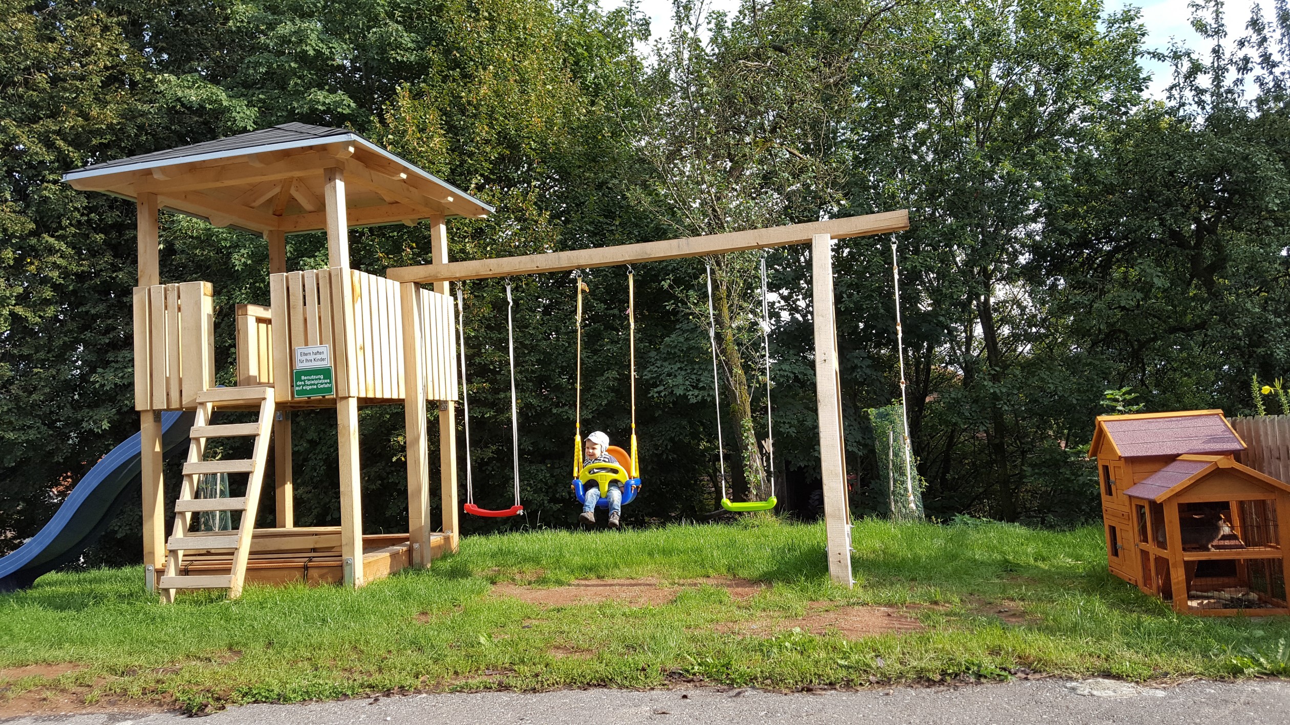 - Spielplatz mit Schaukeln und Spielturm mit Rutsche und Sandkasten